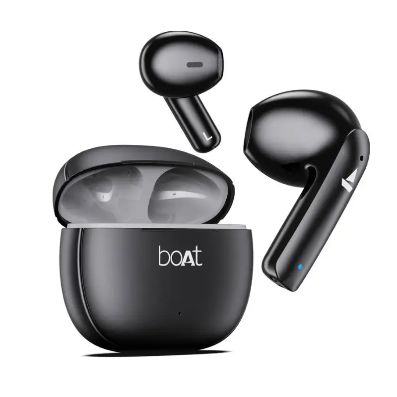 Enjoy long-lasting sound with Boat Airdopes 100 wireless earbuds featuring up to 50 hours playback, quad mics with ENx™ technology for clear calls, Bluetooth connectivity, and BEAST™ Mode low latency for seamless music and gaming.