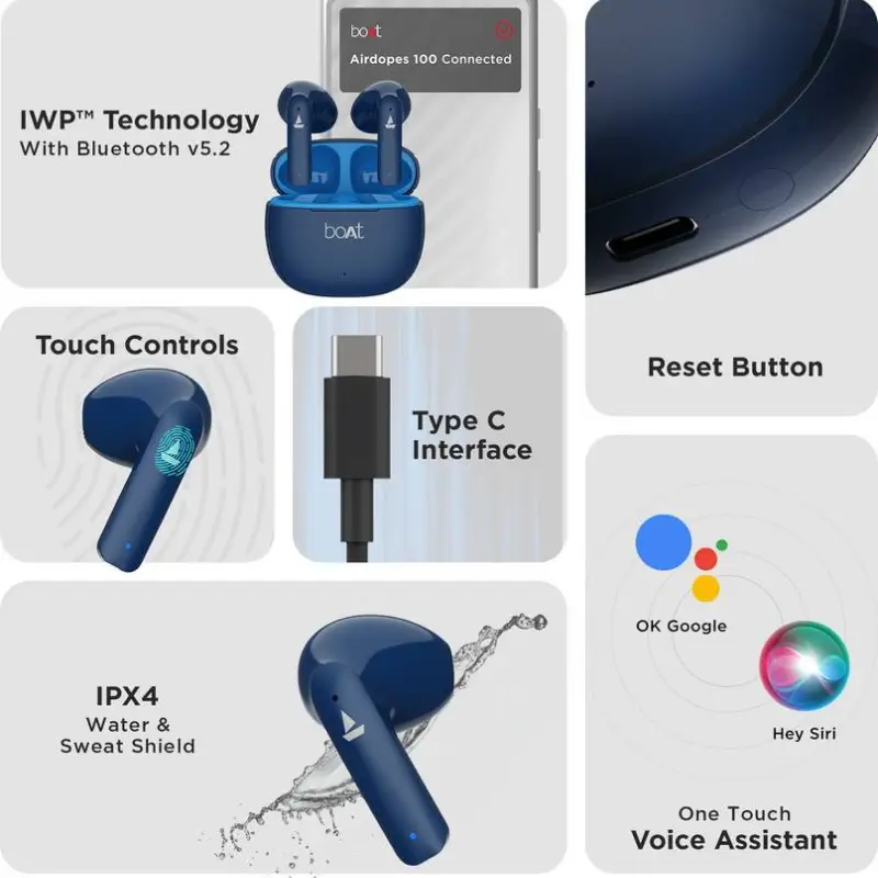 Thanks to Bluetooth v5.3, you get a stable and quick connection to your smartphone or tablet. The ASAP™ charge feature gives you up to 60 minutes of playtime with just a 5-minute charge — perfect when you’re in a rush. With IPX4 water resistance and a compact charging case with Type-C support, the Airdopes 100 are designed for everyday versatility and comfort.