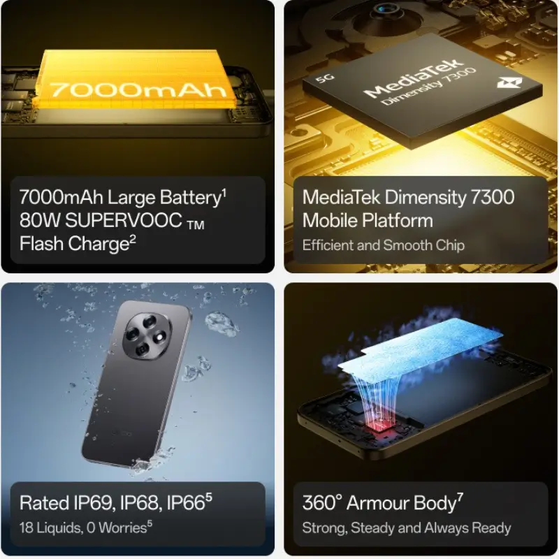 Power through your day with the massive 7000mAh battery โ designed to last and built for durability. When itโs time to recharge, the 80W SUPERVOOC fast charging gets you back to 100% in no time, making low-battery anxiety a thing of the past.